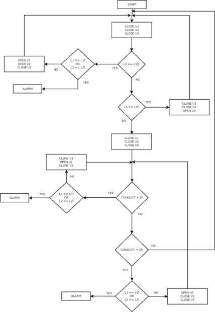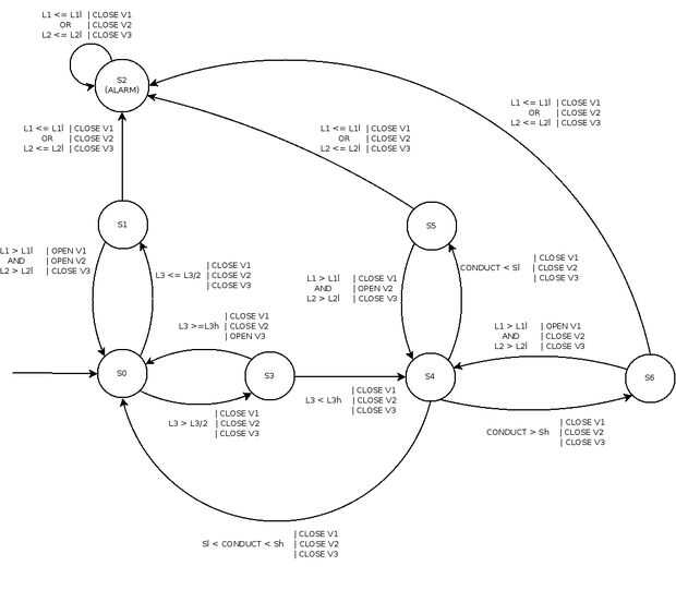 En el último paso se muestra el proyecto completo. Usted puede encontrar el esquema de cableado de Fritzing en un paso anterior. En el lado izquierdo es el sistema de iluminación con los diodos y los transistores. En el centro existen los reguladores de tensión y los sensores (de temperatura y humedad, para los niveles de tanque y para conductividad). En el lado derecho es el sistema de conducción de las válvulas de solenoide (con el transistor y los relés). El sistema de control de válvulas de solenoide se representa en el diagrama de flujo adjunto. Con este flujo de trabajo que podemos controlar las válvulas de solenoide para ajustar la proporción exacta entre el agua y la solución nutritiva. Contiene algún cheque que inhiben el sistema cuando el depósito de agua y el tanque de solución nutriente están casi vacíos. Cuando la solución se diluye poco (conductividad > Sh) se abre la electroválvula del tanque de agua mientras que cuando la solución se diluye demasiado (conductividad < Sl) se abre la electroválvula del tanque de solución nutritiva. Cuando estos dos tanques están casi vacíos, el sistema cierra las válvulas de solenoide y enviar una alarma mediante un SMS. Cuando el nivel del tanque de la planta es demasiado alto, el sistema abrirá la electroválvula correspondiente. Desde el diagrama de flujo fue derivado el correspondiente esquema de máquina de estado finito (véase imagen) utilizado en el bosquejo.