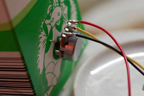 -al soldar los componentes, utilizan algunas "manos" o similar para mantener el componente fijado, esto evitará accidentes. En la foto estoy reutilizando un viejo cartón de leche donde perforó los potenciómetros para soldar los cables uno por uno