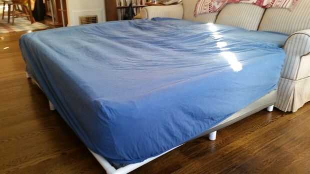 mi novio y yo apenas se movió en nuestro nuevo lugar; Cuando nos encontramos sin un sofá lo suficientemente grande para toda la familia (él, yo y nuestras mascotas), hicimos este sofá descansar en una cama llena de DALSELV IKEA (que ya tenía) y un ca