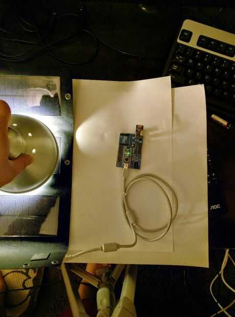 Si estás en condiciones de poca luz, o en el interior por la noche como yo, la configuración simple puede ser que necesite un poco de ayuda (aquí estoy presionando una lámpara contra la célula para levantar un poco la tensión), pero la mayoría de otras condiciones (incluso nublado fino trabajado en mis pruebas) todo debería funcionar solo.