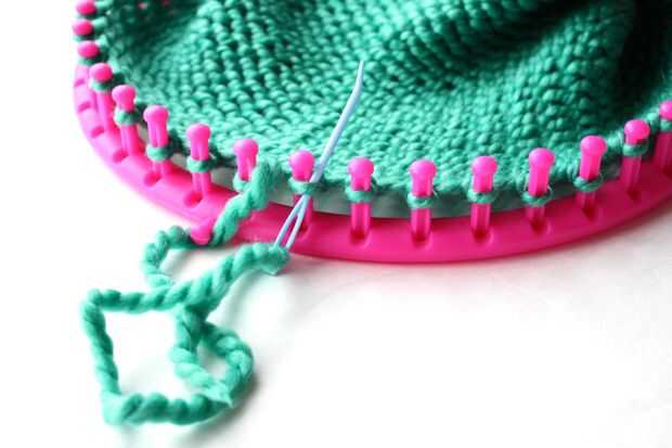 Empuje la aguja hacia arriba en el lazo en la clavija a la derecha de donde está tendido el hilo de trabajo. Cuidadosamente tire del lazo de la clavija y en el hilo. Seguir haciendo esto todo el camino alrededor.