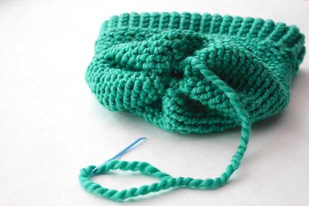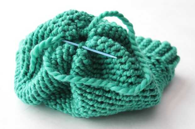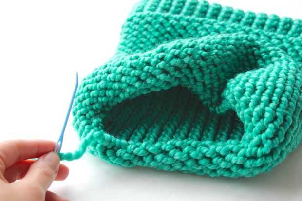 Con el sombrero aún derecha hacia fuera, empiezan a tirar del extremo del hilo agradable y apretado.