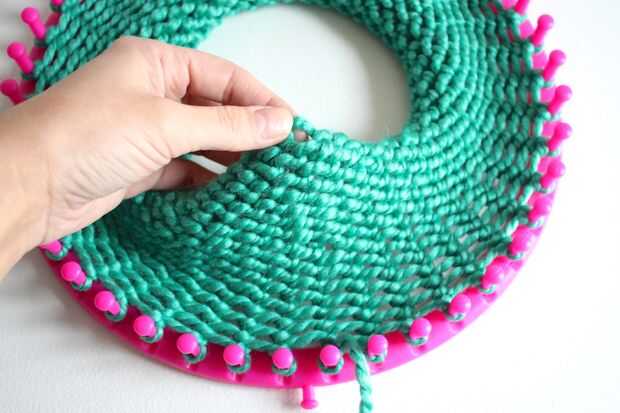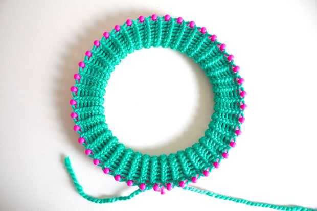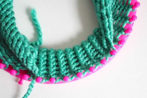 Sentir a lo largo de los inicios del hacer punto - usted notará que en el borde hay grandes bucles abiertos. Vamos a tomar estos lazos y ponerlos encima de las clavijas. :)