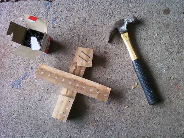 3. Clavar las piezas más en una cruz como en la foto 2. Asegúrese de que las puntas de las uñas no son salientes--a rayar el piso.