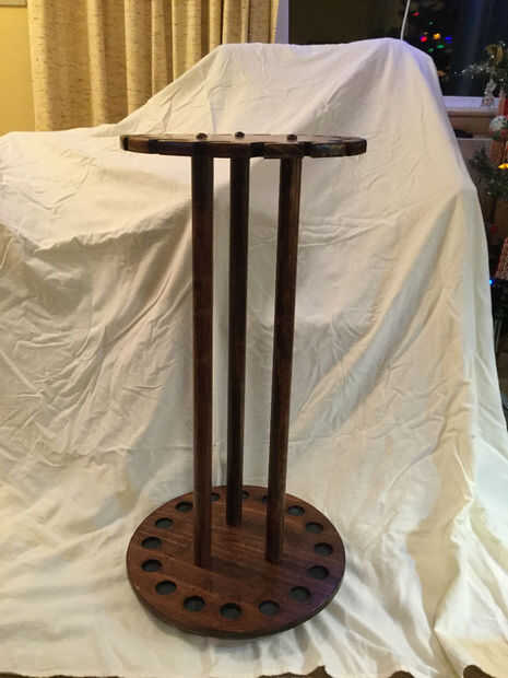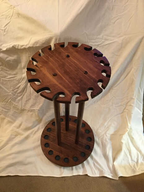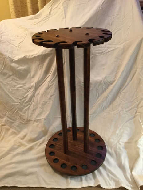 Hice una caña de pescar parado para mi yerno. Usé mis nuevas habilidades aprendidas con un router para lograrlo. La placa inferior que se muestra es un círculo se unió a 16", el círculo superior es un círculo de 14" no se unen, también es un círculo bajo la pieza inferior que es 10".