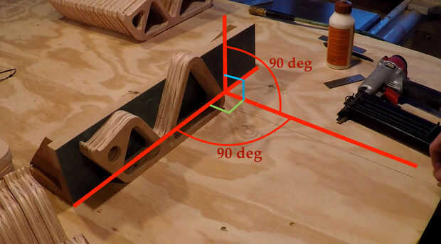 Antes de empezar a pegar y clavar aunque querrá configurar una plantilla poco para asegurarse de que obtener todo cuadrado. Esto es una plantilla muy simple. Básicamente, está creando simplemente un ángulo perfecto de 90 grados con la mesa. Y luego dibujo una línea de 90 grados para. (ver la primera foto para entender lo que quiero decir)