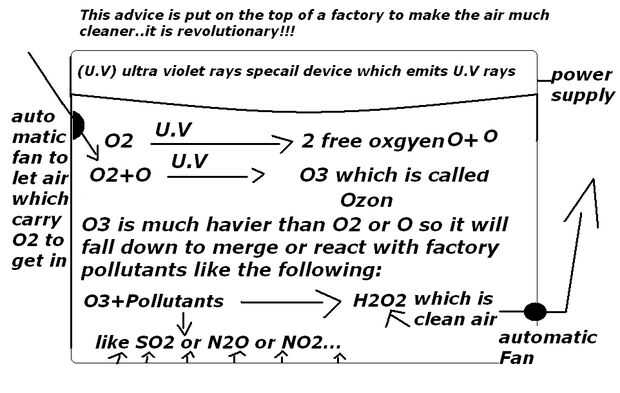 este dispositivo es revolucionario a la naturaleza y el calentamiento global, que se hace para reducir la contaminación de las fábricas con un porcentaje de 98.456%, se coloca en la parte superior de cada fábrica a aire contaminado para limpiar uno, utiliza la tecnología de los rayos U.V. que es capaz de analizar el aire O2 en libre oxígeno-O-... O2 O reaccionar en O3 que reacciona con los contaminantes y gases de la fábrica y convertirla int H2O2 que es aire limpio blanco como las nubes limpia y frescas... imagina si todas las fábricas de utilizan y desarrollan este Consejo... entonces creen globales calentamiento se convertirá en nada