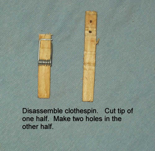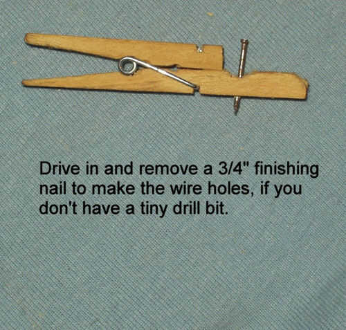 Si no tienes una pequeña broca para hacer los agujeros con, sólo puede conducir en y saque un 3/4" acabado de uñas. Si la madera se divide, aún puede trabajar. Si se divide mal, probar con otra pinza para la ropa. A veces no partieron.