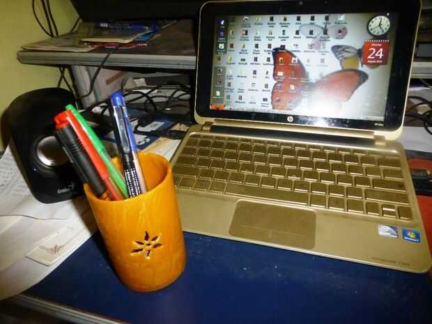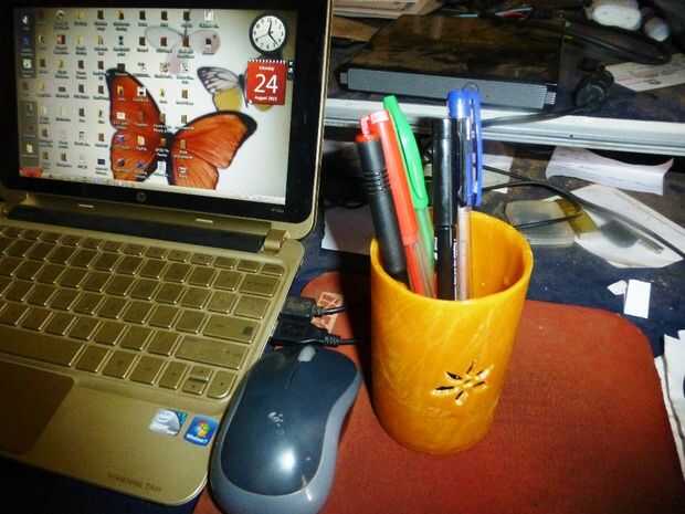 El sostenedor de la pluma de cera puede colocarse en cualquier lugar en su escritorio de la computadora o en su mesa de trabajo.