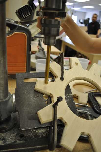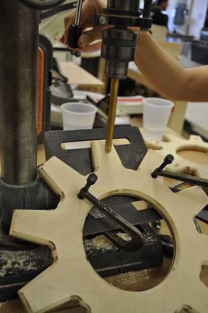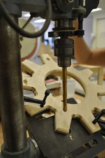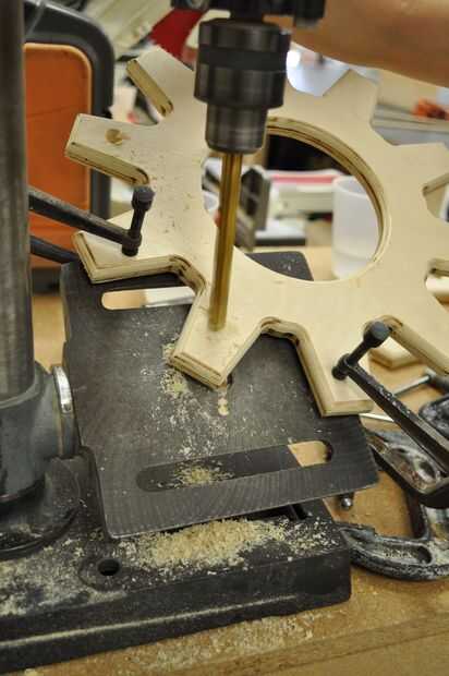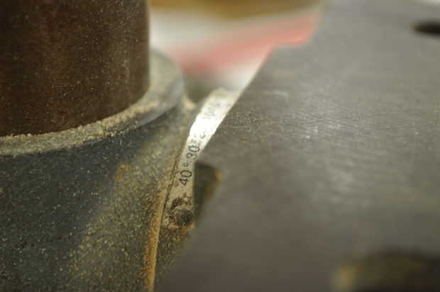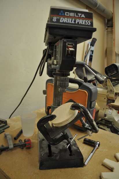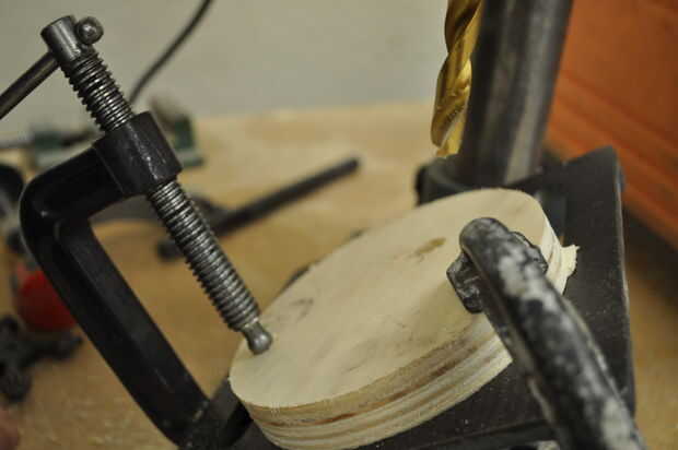 utilicé el taladro para perforar agujeros poco profundos para las espigas (para las manijas de la taza enganchar a). El ángulo de la base puede cambiar, así que lo cambié a un ángulo de 30 grados. Esto garantiza que todos los ángulos de mi agujeros sería uniforme. Usé pinzas para medir la clavija para averiguar qué broca sería mejor. Usé un pedazo de chatarra para probar el ángulo y la profundidad del taladro. Luego monté mi equipo en la prensa del taladro, y aseguró que no cambiar la dirección de la marcha en todos, yo sólo moví arriba y abajo. Si he cambiado la dirección de la marcha, todos los tacos estaría frente a diferentes direcciones.