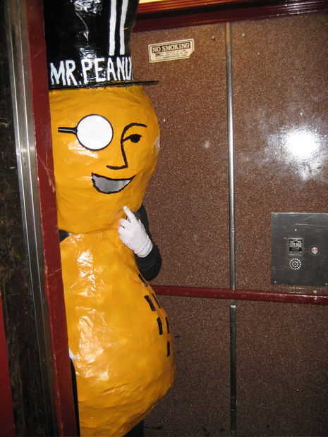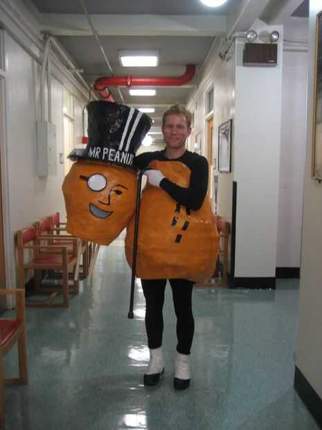 Aquí está el producto terminado, un dos piezas traje de Sr. Peanut. Usted debe aceptar caminar en él, ya que se puede ver * y * tienes un bastón de apoyo, pero todavía tener cuidado. Es probable que se ejecute su sombrero en cosas puesto que ahora estarás cerca de 8' de altura. Las puertas y los árboles maduros son los más difíciles. Disfrute del traje y tratar de evitar la lluvia (aunque la pintura brillante debe ser un poco resistente al agua).