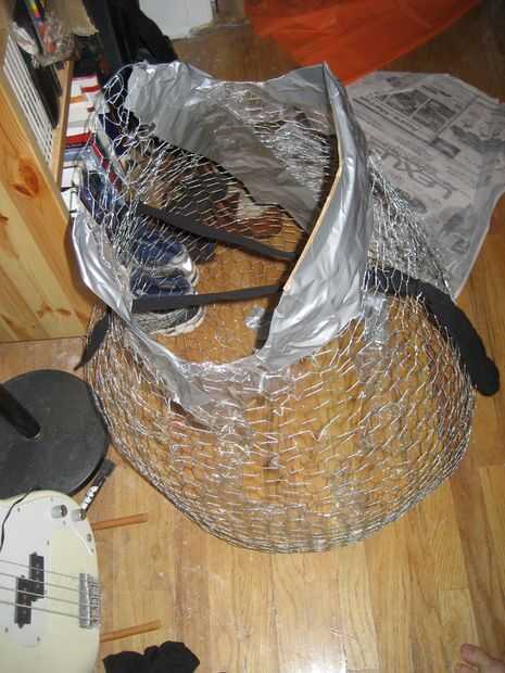 Además, tienes que envolver los filos con cinta aislante para que no pique tanto. En particular el interior debe tener cinta adhesiva a lo. También he añadido algunos cartulina donde la malla de alambre era un poco desigual.