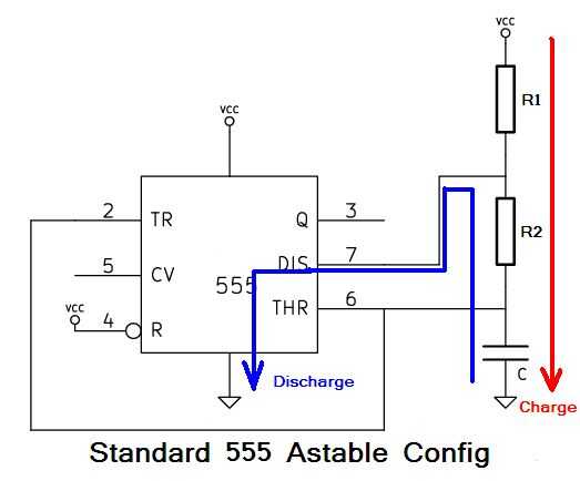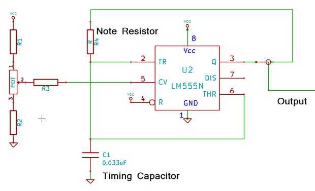 En una configuración estándar, un 555 permite el condensador de temporización (C) a cargarse mediante R1 y R2, pero descargada usando un pin de descarga separada (pin 7) sólo a través de R2 - esto significa que la tapa de carga mediante una ruta de acceso y descargas con una ruta de circuito diferente, resultando en una salida que no puede gastar cantidades iguales de tiempo siendo alta y baja [es decir la salida no tienen un ciclo de trabajo 50%]. Esto es especialmente cierto cuando se cambia una de las resistencias para cambiar el tono.