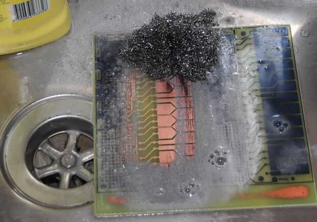 Una vez que estaba feliz de que las juntas habían terminado grabado, colocó en un baño de enjuague para detener el ácido de comer el cobre. Mientras se aclara, tomé uno de los tableros y limpia el toner de usando lana de acero. Tanto de los consejos tiene un buen enjuague con agua durante unos 5 minutos, cuando se saca y se secaron.
