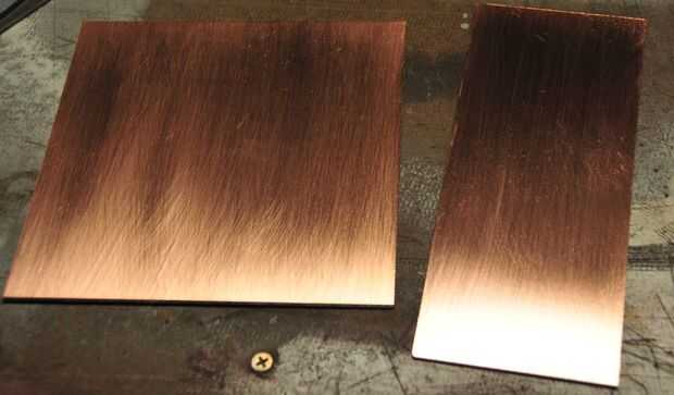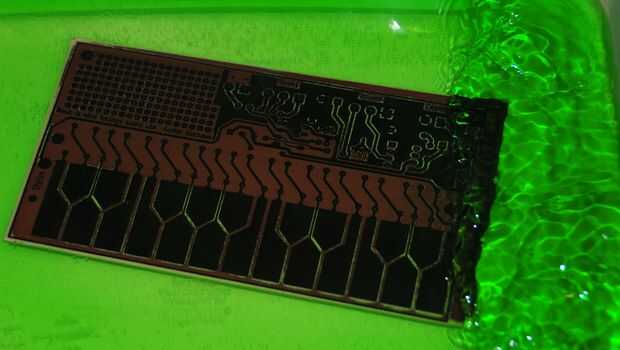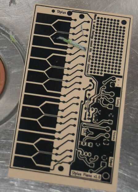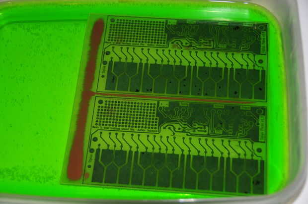 Una vez que estaba contento con la disposición - coloqué las tablas en el grabador - 150ml de peróxido de hidrógeno 6% mezclados con 75ml de ácido clorhídrico (para la limpieza de ladrillos). Con agitación continua, la Junta grabada en unos 4 minutos. Como con cualquier proceso de producción, tenga cuidado con los productos químicos - proteger su cuerpo utilizando equipo de seguridad apropiado y proteger las superficies de trabajo. El grabador dañará su fregadero de acero inoxidable si lo dejas. Esta cantidad será hacer cómodamente tableros de 2 o 3 mas de 6 "x 6"