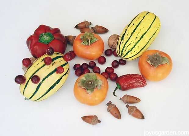 Foto 2- Una muestra de la generosidad que he utilizado: pimiento pimientos, caquis, calabaza delicata, jalapeños rojos, arándanos, nueces y bellotas. Como se puede ver, tachas 1 de delicatas con arándanos sólo por diversión.