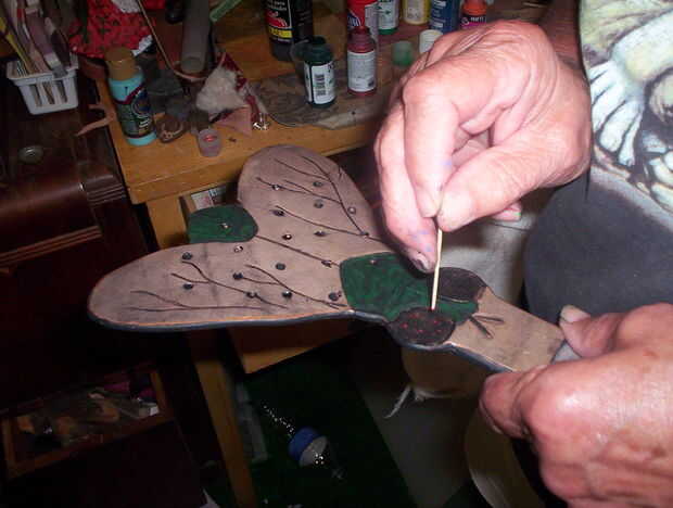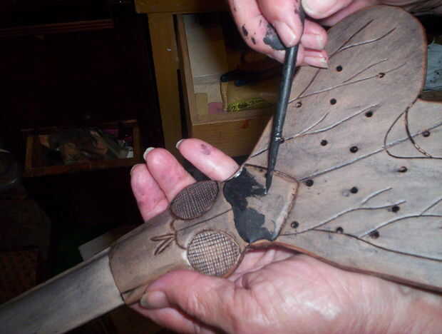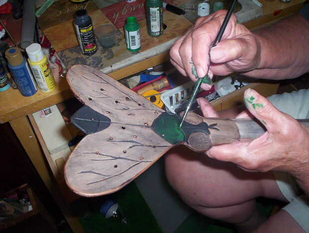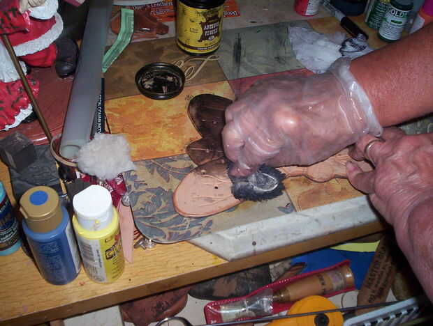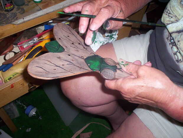 Opté por mi matamoscas de color, pero puede ser a la izquierda el color natural de la piel o envejecido. Tomé Fieblings negro antiguo y diluido sobre 50/50 con Tan Kote. Esto hace que el antiguo menos oscuro y va en más suaves. Después de la capa el swatter todo y la manija, tomó una toalla de papel húmeda y ligeramente sobre la totalidad del proyecto. Tomé el acrílico negro y pinta la cabeza, corazón, parte posterior, ojos y las venas de las alas. Luego ponga bosque verde en la cabeza, parte posterior y parte del corazón y mezclados con mi dedo. Para obtener al tipo de sombra iridiscente tuve un producto de oro llamado permanente luz verde que mezclado también con mi dedo. Moscas tienen un montón de receptores de luz en sus ojos y para indicar que tomó palillos y había sumergido en diversos colores y puntos sobre los ojos. Después de toda la pintura estaba seca, yo le dio una ligera capa de capa de bronceado para proteger la piel.