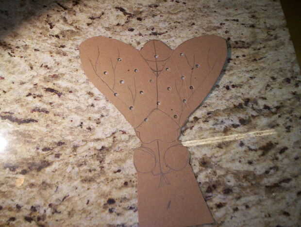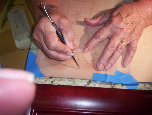 tuve un amigo Dibújame una imagen ampliada de una mosca.  Entonces se transfiere el diseño a la película de la localización. Humedecer el cuero y se coloca la película en una de las piezas de 9 x 7 de cuero.  Trace el patrón en la piel.  Girar el patrón y copia el patrón en la segunda pieza de cuero de 9 x 7.  Esto le dará una imagen de espejo para que las piezas se ajuste cuando vayas a ponerlos juntos. Sólo marcan los lugares para los orificios en un lado del patrón.