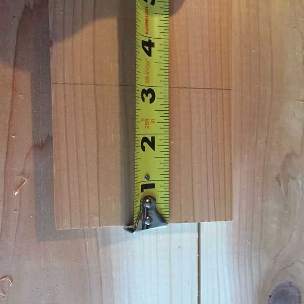 - Dividir esa longitud a la mitad. Marque una línea en su pieza. Para mi pieza, tenía 3 pulgadas de sobras, así que hacer una marca de 1,5 pulgadas desde el extremo.