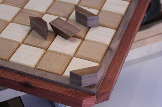 Un tablero de Ajedrez 3D nivel múltiples. Hecho de madera de nogal, cada bloque está a una altura diferente para agregar un factor artístico y divertido del clásico juego de ajedrez. Con un taller adecuado y unos trozos de madera de nogal, puede cons