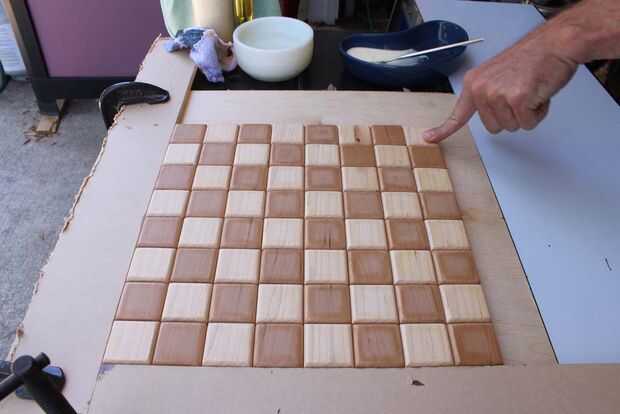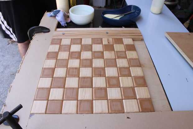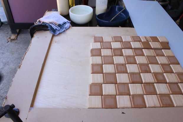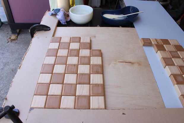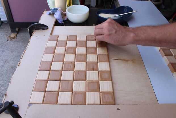 Mejor alejarse de él y dejar que la elasticidad de la losa de granito incluso lo presión necesita. Si se aplica una presión uniformemente, las Naciones Unidas el riesgo de hacer el deslizamiento de piezas. Déjalo sentarse de noche y yo estaba feliz de ver a todas mis fichas pegadas firmemente en su lugar y no hay pegamento squeeze-out. Luego pegué la placa de soporte con las plazas a otro pedazo de madera contrachapada de 1/4". No pinzas, sólo la toalla, la losa de granito entonces algunos pesos y una sección de tronco de árbol bastante grande para el peso adicional.