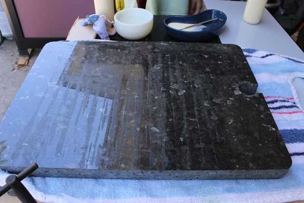 Una bolsa de arena funcionaría después, pero tengo un fregadero de granito muy plana muy pesada recorte. Me coloca papel encerado y luego una toalla sobre los azulejos (para protección) y luego suavemente se coloca la losa de granito en la parte superior.