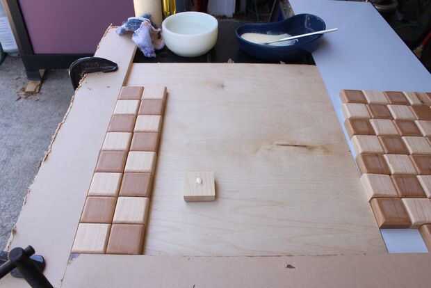 Una vez que tengas todo listo. Separar los bloques de madera de color y entregar las fichas y ordenarlas en orden de número (la razón de hacer esto es para que coincida con el grano de baldosa a baldosa del mismo color... Hacer 8 filas y 4 columnas de cada color.