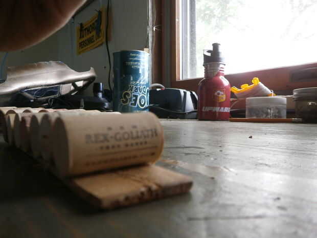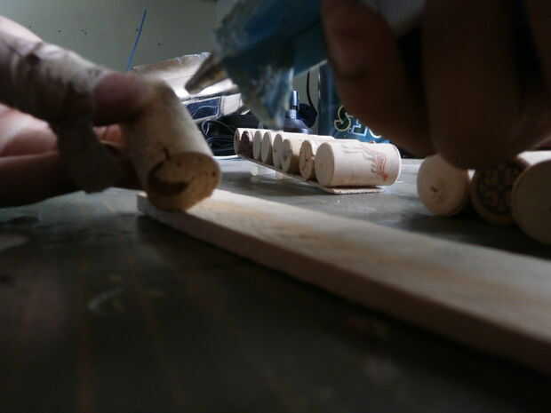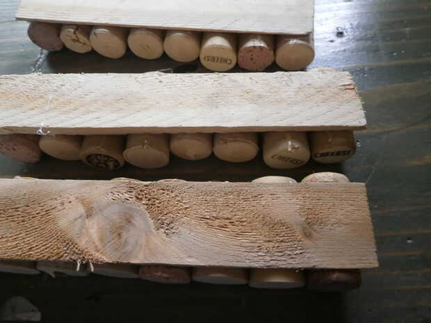 materiales:* 1 pedazo de madera (ej. roble) de ~ 80 * 3 * 1. 5 cm (32 "* 1,5" * 3/8")* 64 corchos de vino* madera-pegamento (preferible impermeable)* aceite* papel de lijaHerramientas:* Sierra, preferible una sierra de calar* CúterTiempo: t