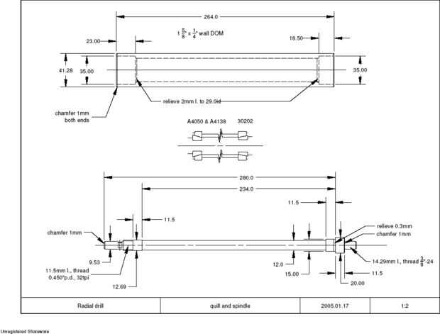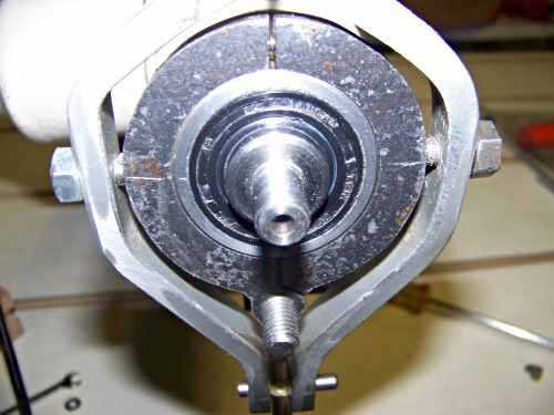 La nariz es roscada para mandriles ordinario. He dejado un poco limpiado de la superficie exterior original para el sello delante del asiento de cojinete inferior. El rodamiento superior tiene un ajuste un poco más flojo en el eje y tiene un diámetro más pequeño, y se mantiene en su lugar con el sello casero y tuerca cojinete comprado. El diámetro más pequeño está en el extremo de la polea.