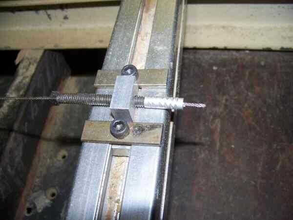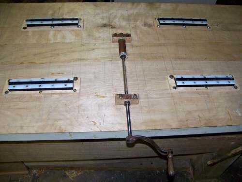 La tabla está separada del taladro pero lo hice así pude usarlos juntos. Es una caja de torsión hecha de trozos de madera contrachapada y la haya; es 150x80cm con cinco estándar 1/2" t-slots y sistemas con cuatro Cojinetes lineales caseros en los carriles de rieles estructurales de aluminio de extrusión de Bosch Rexroth que encontré. Una manivela en la parte delantera gira una polea envuelta con cable para mover la tabla lateral.