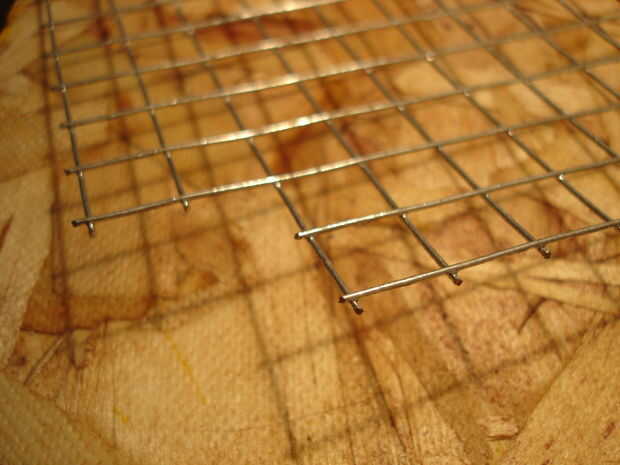 Tome la parte superior del cubo y utilizarlo como plantilla para el paño del hardware. Deje una pulgada o así sucesivamente a cada lado. Cortar cada alambre con cuchillas laterales o una herramienta dremel. Cortar cada esquina para que coincidan con las esquinas de la parte superior del cubo y doble los lados hacia arriba.