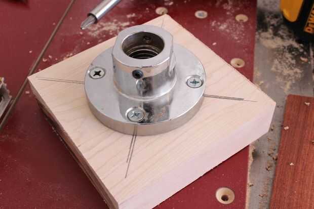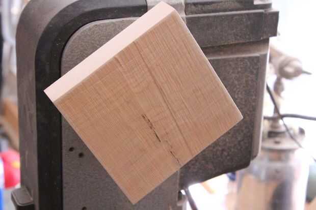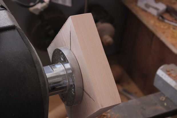 Después se perforan los orificios Coloque la placa frontal. Ahora atorníllelo a su bloque de madera y montar el faceplat con el bloque de madera en el torno. Es un buen momento para lijar todos los bordes. Comience con 80 y vaya grano 320.