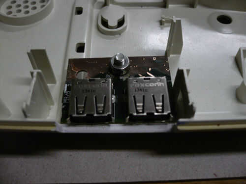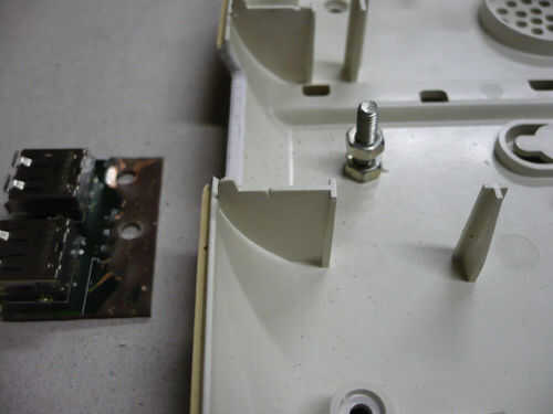 Cuando hicieron la apertura, hacer un agujero de 4 mm en la base, llevar sobre la base del teléfono y perforado también. Inserte un tornillo largo que sujeta con una tuerca y una tuerca se puede regular la altura de la Junta. No arreglarlo.