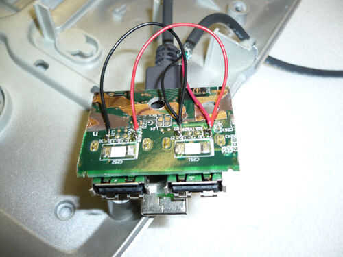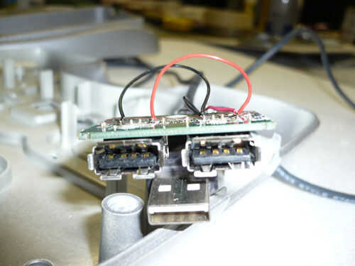 De la soldadura de los dos cables en las piernas de los dos puertos USB. Siga el diagrama y fotos para soldar en los lugares apropiados. El cable rojo es + y el negro es tierra. Preste atención a las conexiones y no fuera corto. El cable de señal que no he ligado porque son innecesarias y crearía problemas de conflicto en el PC, si las dos salidas están completamente aisladas unos de otros, en este caso se puede conectar sólo una de dos salidas.