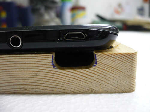 Alisar con lija para el interior que fueron cortadas. En este punto se debe practicar una ranura para el conector USB cargar el teléfono. Ponga el teléfono en el pedazo de madera y dibujar la cantera, cortar y lijar siempre con la sierra caladora.