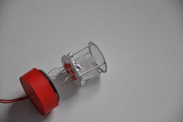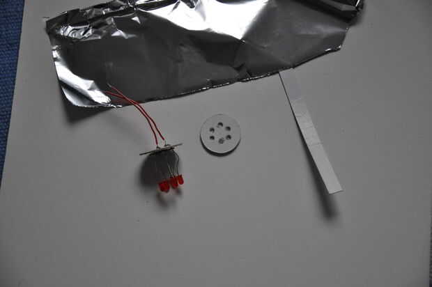 Seis agujeros se hacen en un otro disco de cartón del mismo tamaño. (diámetro interno del tubo) Los LEDs son empujados a través de esos agujeros. Un papel de aluminio se pega en la cartulina (no el LED) para reflejar la luz que va hacia atrás.