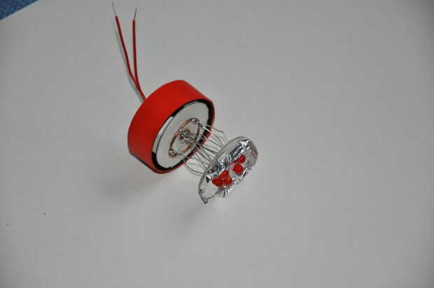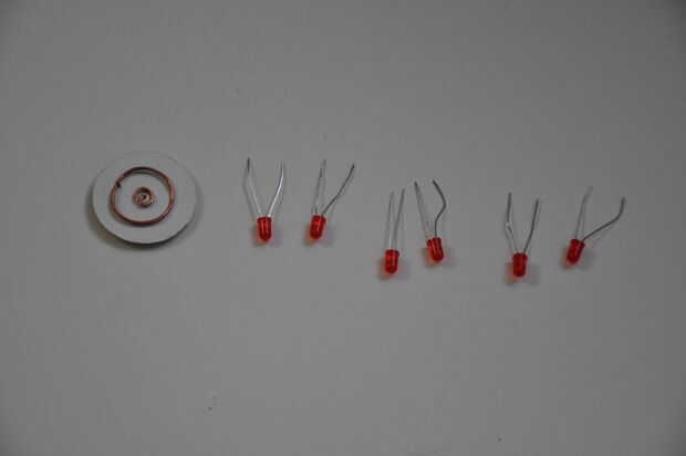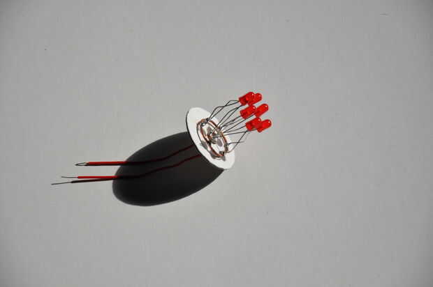 Se utilizan los LEDs en paralelo, su cátodo y el ánodo se sueldan en dos piezas circulares de alambre de cobre. Una pequeña en el centro para los cátodos y un anillo más grande para los ánodos.