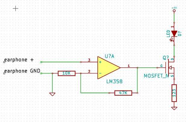 La señal que sale de un conector de audio es amplificada por no invertir el circuito del amplificador operacional. Este circuito tiene el propósito de ampliar la amplitud de la 'sonido' de 0 a 5 V. Esta señal amplificada entonces va a la puerta del MOSFET donde entonces por consiguiente controla el flujo actual a través del LED.
