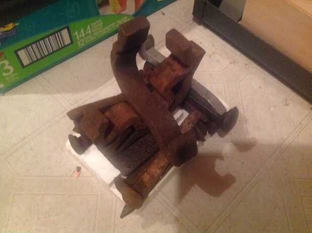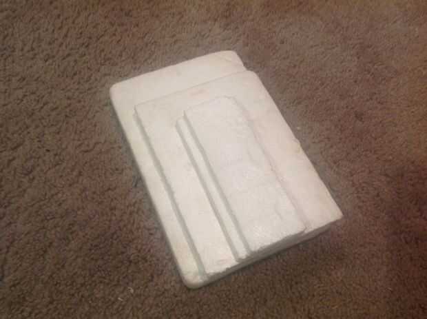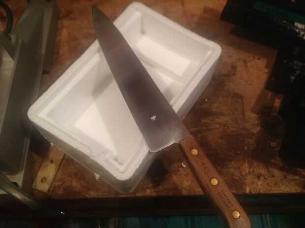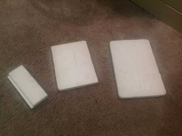 En primer lugar, obtener poco de espuma. Creo que la espuma de poliestireno (también conocido como espuma de poliestireno) funciona mejor para que esta, así que trato de conseguir algo. Debe ser muy común - oí que tiendas de muebles podrían incluso darle algunas gratis. Empecé con alguna caja de forma irregular había hecho de espuma de poliestireno y comenzó al carnicero con un cuchillo de cocina grande (Foto 2). Una vez que éstos se cortaron en láminas planas más agradables (Foto 3), I (woodglue) les pegan para hacer un bloque más grueso (con una parte extra gruesa para la manija) y comprimidos (con picos de hierro del ferrocarril) para deshacerse de cualquier espacio entre las costuras (fotos 4 y 5). Básicamente, usted necesita un bloque de espuma de poliestireno; puede ya tienes la tuya en la forma correcta.