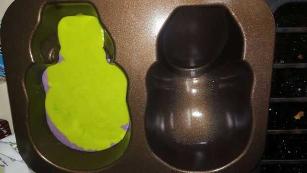 se puede utilizar cualquier molde para pasteles, he encontrado este pan en forma de calavera en tj max. Coloque un color en un momento en el molde para pasteles, trate de no mezclar.