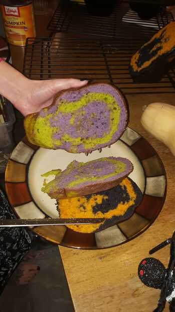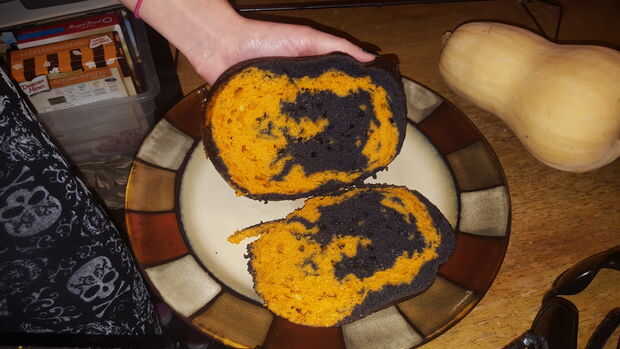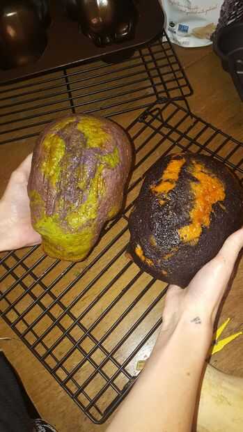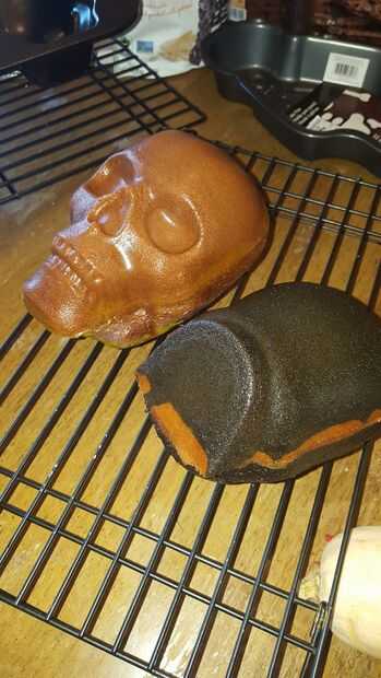tu pastel debe ver algo como esto cuando listo. Si usted hizo el cráneo deberás cortar los extremos para hacer liso así que usted puede poner juntos más adelante.
