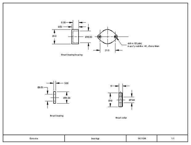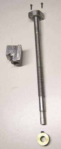 El tornillo de sujeción es de 3/8"-20 rosca izquierda. Usé el orificio roscado de la tuerca para un calibre ya que es más fácil que medir el diámetro de la echada con los cables por lo que es probablemente de gran tamaño. Aburre la carcasa pero el exterior sólo es aserrado y presentado a la forma. El collar de 5/8" en el extremo del tornillo es presión, y la arandela de empuje es también presión en la caja después de llenar con grasa. Ud. no encuentra el collar de eje pequeño hasta luego tuve que hacerlo más corto para que quepa el tornillo.