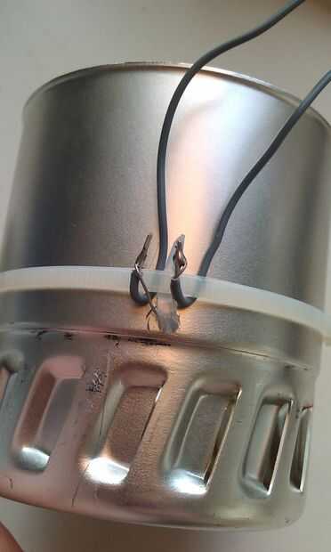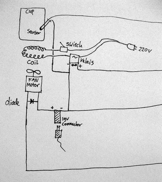 Los contactos del motor del ventilador están desconectados del resto de la electrónica y conectados a dos cables de corriente de la máquina de palomitas de maíz. Un diodo es colocado entre los dos contactos para detener la electricidad producida por el motor, después de que se apaga pero sigue girando. Como fuente de alimentación, se instala un enchufe para conectar el adaptador de 19v de mi laptop.