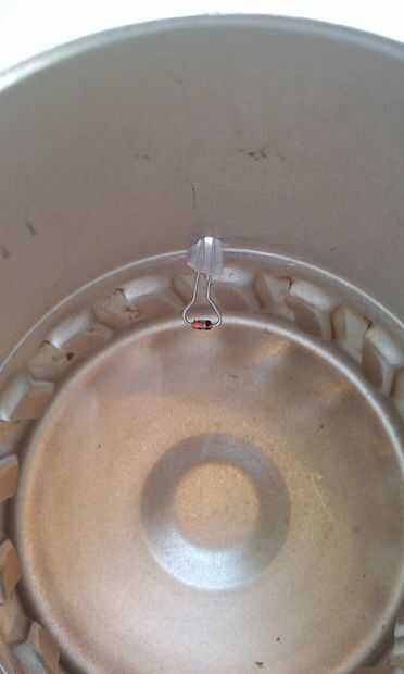 El sensor se instala en el interior de la Copa de aluminio, justo por encima de las mangas, ya que necesita para medir la temperatura de los granos y tostado. Utilicé una pieza de silicio (de una manguera de silicona) para hacer una cubierta a prueba de calor para mantener el sensor en su lugar y evitar corto circuito. Perfore un orificio en la taza y coloque el sensor como se muestra en la foto. Tenga cuidado no toquen los cables del sensor del metal de la Copa. Fuera de la Copa, el sensor está conectado a los cables suficientemente largo el plomo de la máquina de palomitas de maíz. El sensor y los cables están asegurados con una tierap. Cuidar que los cables no toquen la Copa, como puede derretir.
