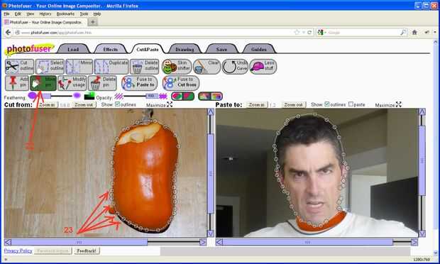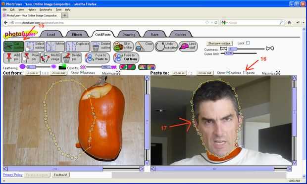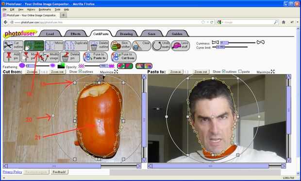 19,20,21: Coloque el contorno de la cabeza sobre la calabaza lo más cerca posible por reposición, rotación y escalado.