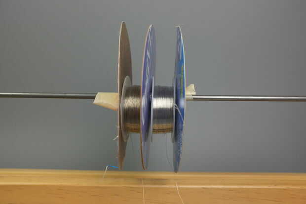 Usted tendrá que poner el cable en un dispensador que puede tirar de. Esto debe consistir en una varilla horizontal que los carretes pueden girar fácilmente en (yo uso dispensador de papel de mesa de arte infantil). Los carretes deben ser la misma dirección de la herida. Cortar unas cuantas bandas de nylon de la media. Coloque uno en cada carrete, roscando el extremo del cable a través del nylon. Esto actuará como un freno para el cabestrante de alambre.