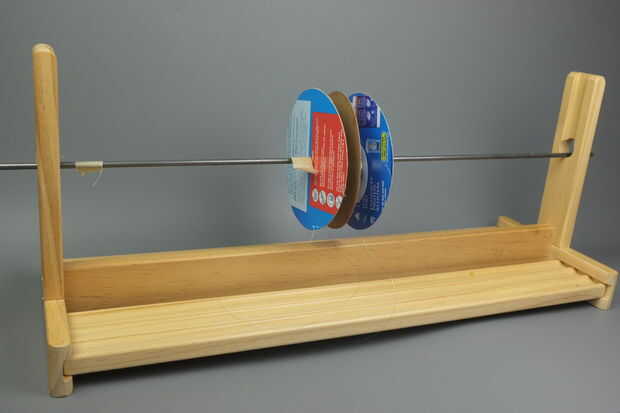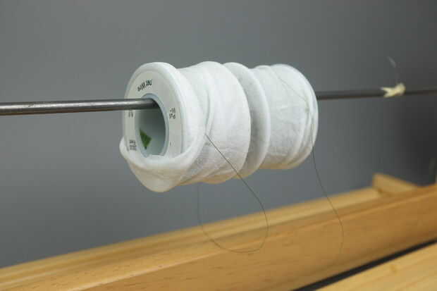 (Para máquina de tejer, estira el nylon sobre la unidad de compensación de tensión mástil. Con esta configuración, el cable de vez en cuando desenrollar y haz envuelto alrededor de la varilla. Solucionó el problema cortando círculos de cartulina y cinta en la varilla en los extremos de cada bobina.)