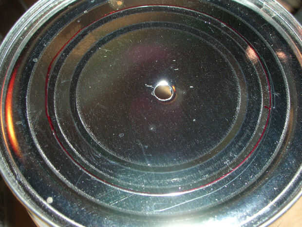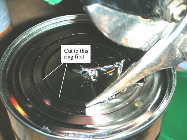 Perfore un orificio de 1/4 en el centro de la lata de café (2) y desde este agujero uso metal tijeras podadoras para cortar el primer anillo (cerca de 1/2 en de la marca (3).