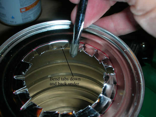 Cortar con tijeras hacia fuera del borde de corte, realizar varios cortes pequeños en la marca (4 y 5) y doble las aletas hacia abajo (5). Y apagar el montante de café puede ahora Pulse sobre otra lata de soda o spray puede así que se deslice hacia abajo sin mucho pressure(6).