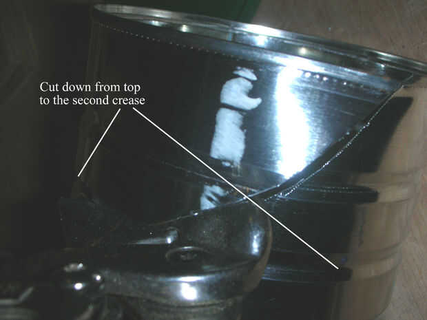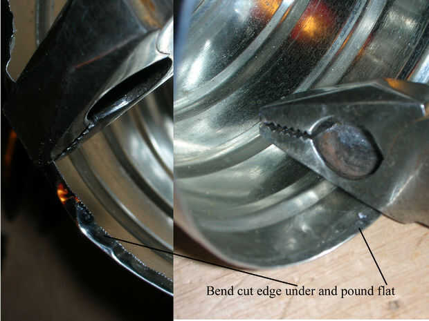 Acortar la lata de café, corte hacia abajo desde la parte superior para el segundo pliegue (7 y 8). Alicate para doblar este agudo, borde del corte sobre para evitar cortarse (8).